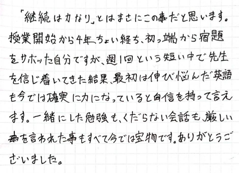上記のメッセージは4年以上一緒に勉強させていただいたお子さんから指導終了時にいただいた手書きのメッセージです。